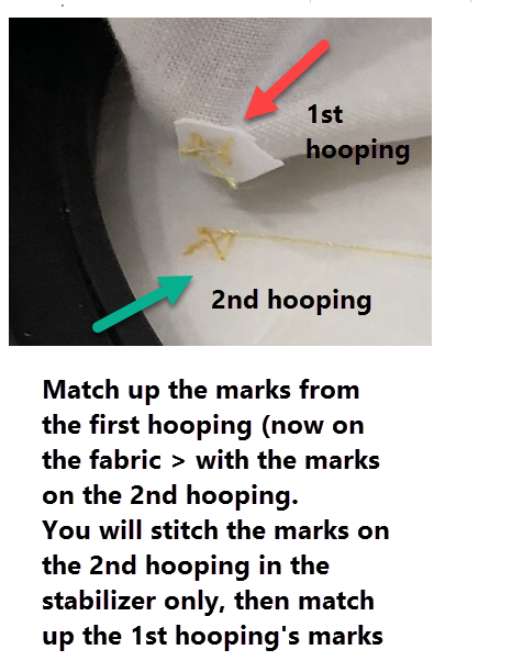 The first color you stitch in the next hooping will be the registration marks. They will line up with the red marks above.